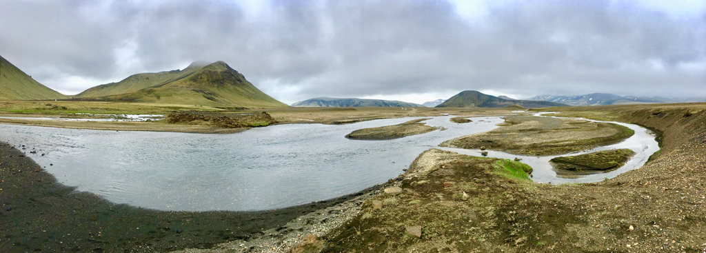 〖痛苦的F路〗沿F225往回开,2点整回到26号路上,继续往北的路没开几分钟就遇到修路,那路简直颠得啊,基本都开不到30公里,比刚才unpaved路还要差,因为unpaved的路没有那么多的大石子!在冰岛开车还有一个特色,那就是“前无古人,后无来者,念天地之悠悠,独怆然而涕下”要是车有点状况,真的是涕下也没用,一个人都见不到。就这样在26号上开了14公里,终于上了F26号路,按理说F打头的路应该是unpaved的路,但F26像是新修的,非常好的路况,可以开到90公里。接下来转208还是挺好的柏油路,路边有一个大湖,湖水蓝绿,即使在有些阴雨的天气下仍然相当养眼。好景不长,指示牌指示F208,过了两个木板桥路马上就变成了unpaved石子路非常非常颠簸。而且石子越来越大,限速60根本不可能开到。一望无际的大平原上仅这一条石子路简直让人怀疑人生,明明是要去爬山的,可看着山可离得太远了。看了看谷歌导航还有一个多小时呢,都得是这种颠簸!