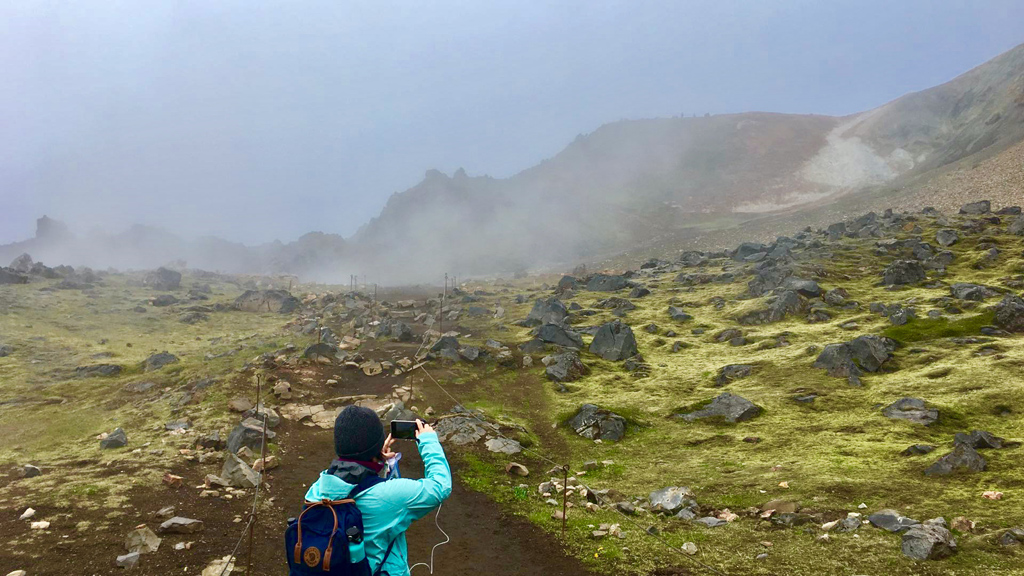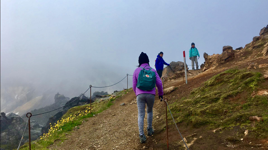 红色步道渐渐提升经过地热区的时候臭鸡蛋味扑面而来,但还是可以忍受。