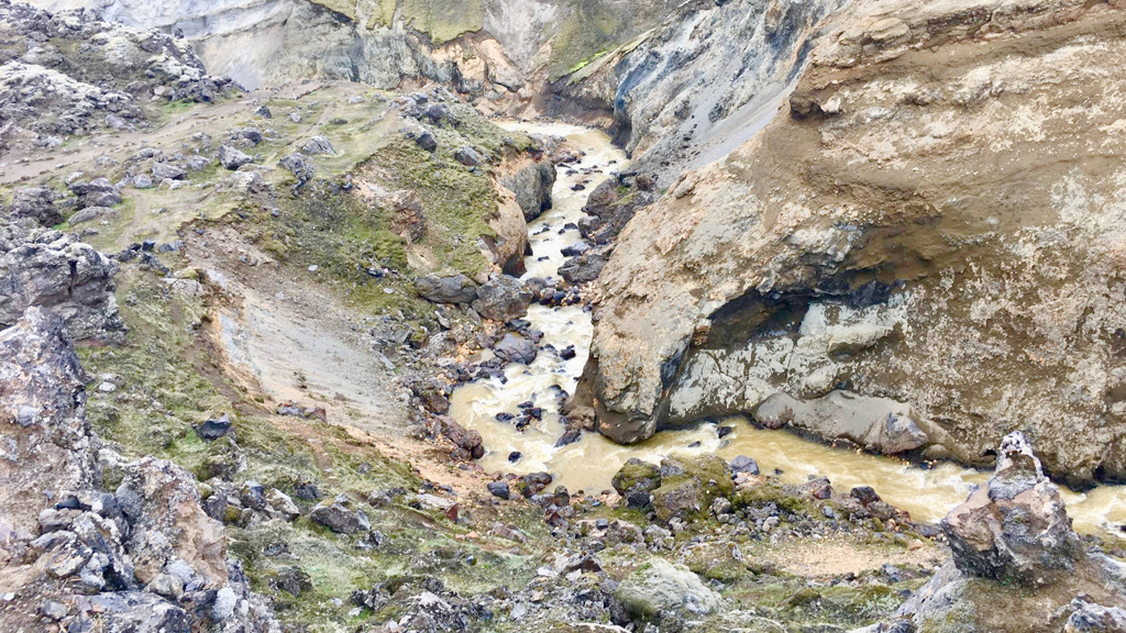 〖捷径遇河折返〗这条路的标号是F225,冰岛的路如果是F开头就是没有铺柏油的土路或石子路,而且大部分是需要过河的。网上讲要开两个半小时,但谷歌的导航只有两小时,说明这条是条捷径,虽然开上土路很颠簸,但周围的景致很独特,而且有很多变化,冰岛的丰富地貌果真名不虚传。大约开了1小时25分的时候,看到前面有五六辆车停在一条河的边上,下车一问,大家都是不敢过河,在观望别的车先过。