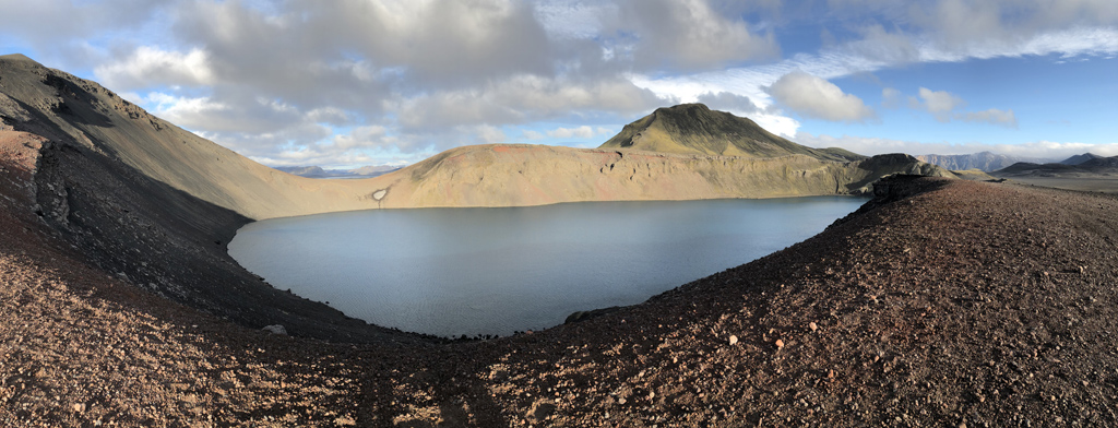 回来的路上见到一个山峰上有几辆车停在那里,有一条土路通向那里,感觉不难到达,就开了上去,结果正是我们想找的Hnausapollur火山口,这一时间这里晴空万里,白云蓝天。火山口内是蓝色的湖水,分外好看。8点半开始回程,路况虽然还是一样的差,因为都是已经开过的路,感觉上对道路的容忍程度已经好多了。11点左右回到旅馆。
