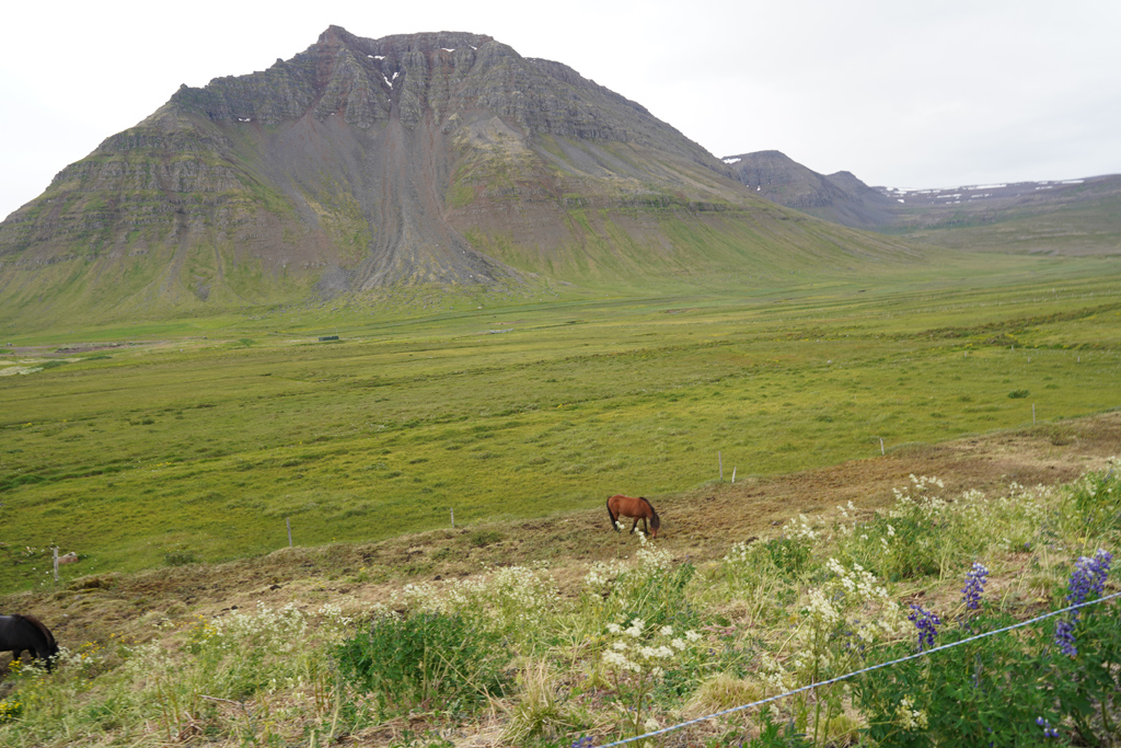 山下的平原和可爱的冰岛马
