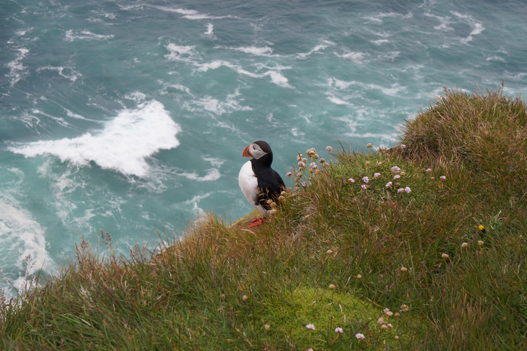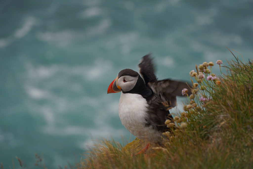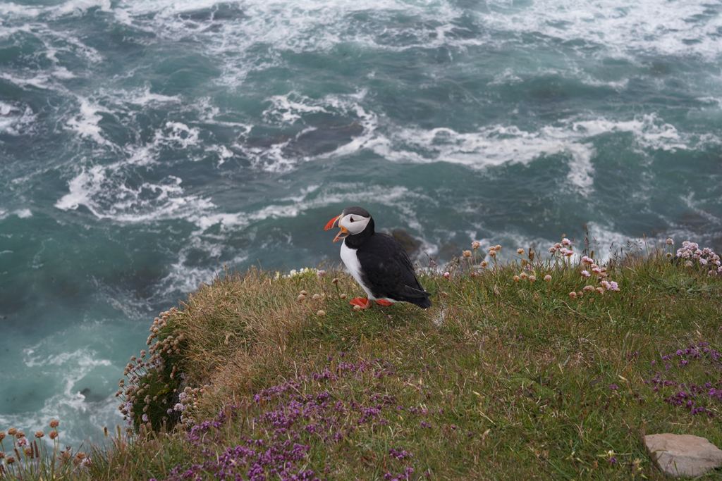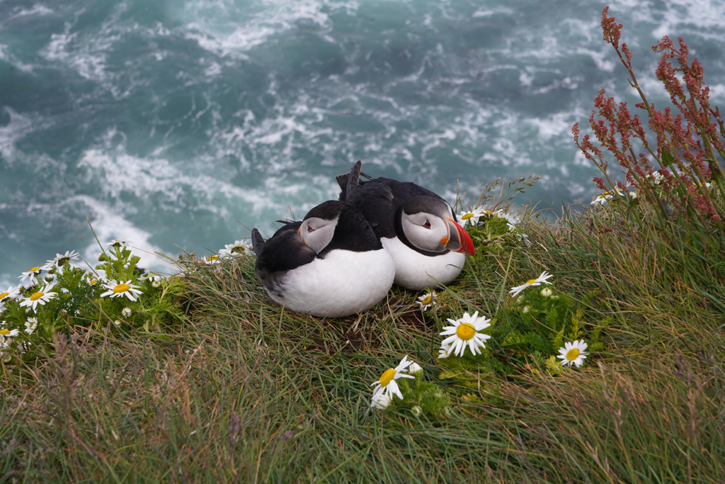 这里的好处呢就是可以拍到Puffin及后面的海,一对Puffin趴在鲜花边,非常浪漫。