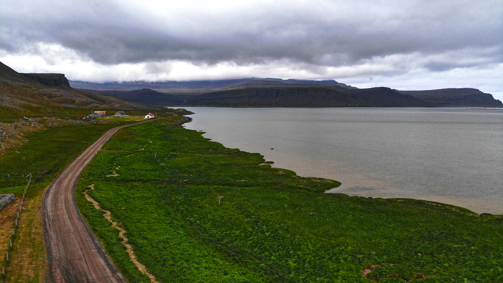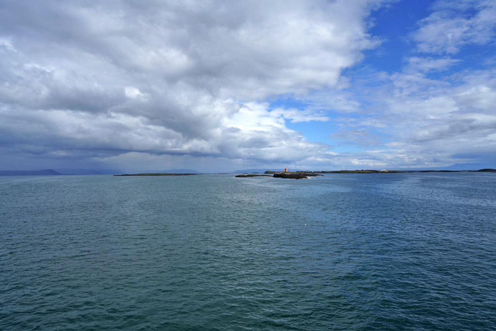 船上可以欣赏峡湾的美丽风光,轻松很多,前面的桔色灯塔是中途停靠的Flatey小岛