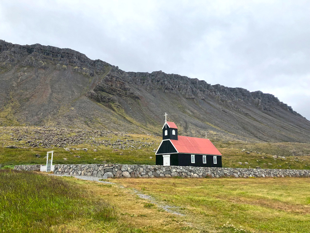 教堂后面的山上就是著名的Bæjarfoss瀑布,有步道前往。