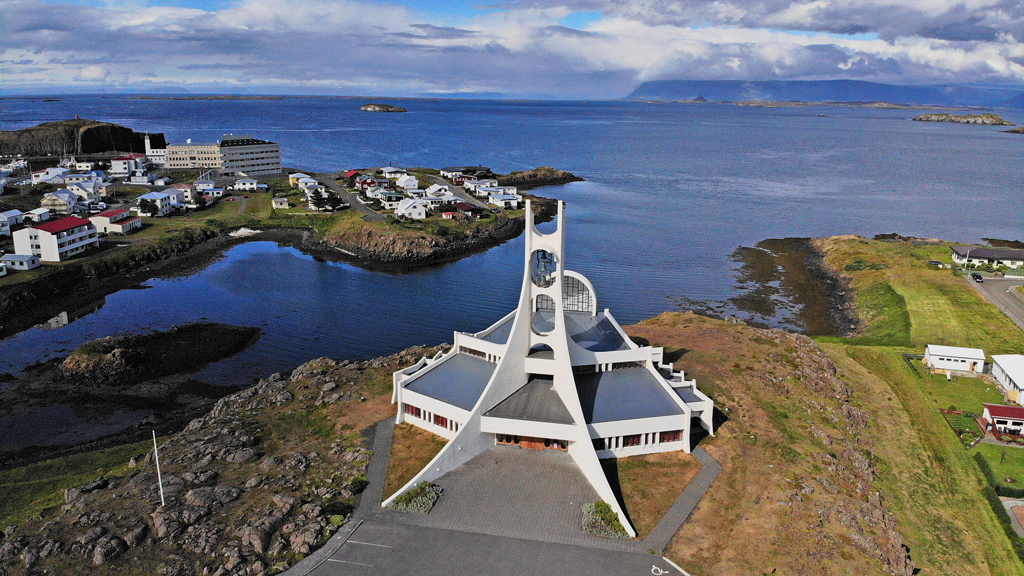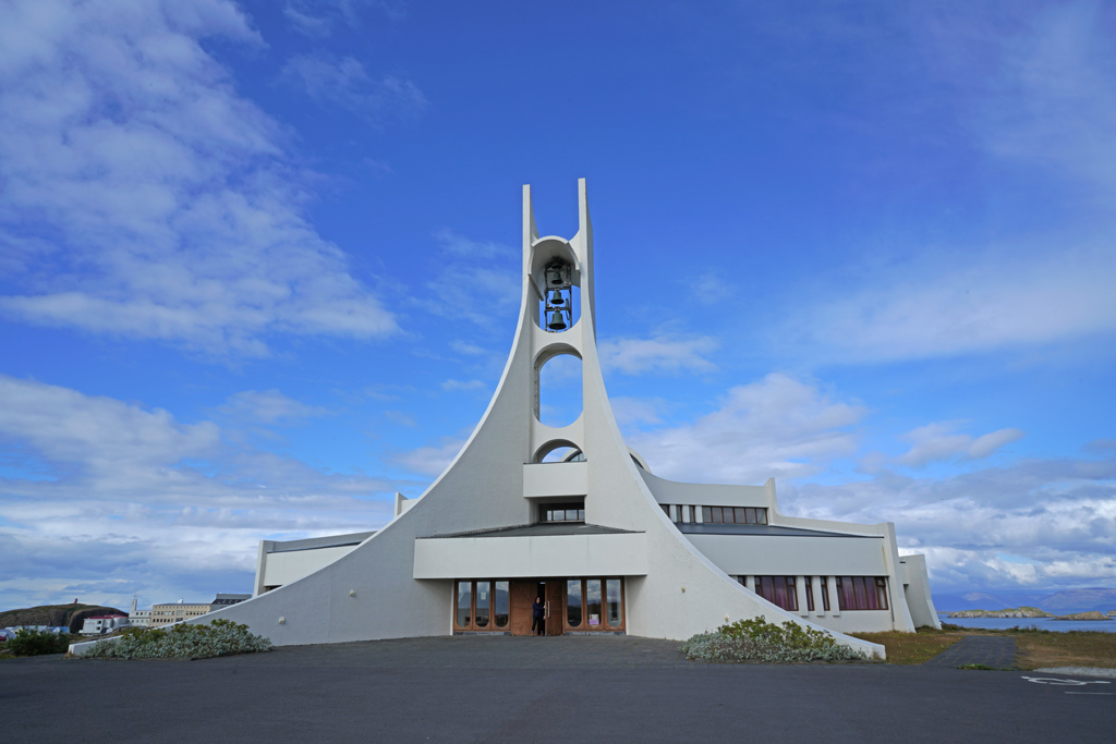 Ólafsvíkurkirkja教堂是座落在Ólafsvík小镇的一座现代风格教堂,以其独特的三角形拼接设计和航海主题闻名。由建筑师Hákon Hertervig设计,整体由三角形几何构件组成,外观简洁前卫,灵感源自冰岛的航海文化,从空中俯瞰形似“鱈鱼”或船帆,因此也被称为“鱈鱼教堂”
