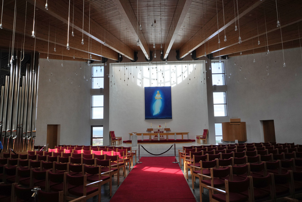艺术细节:祭坛画由冰岛画家 Kristín Gunnlaugsdóttir 创作,描绘圣母与婴儿耶稣。